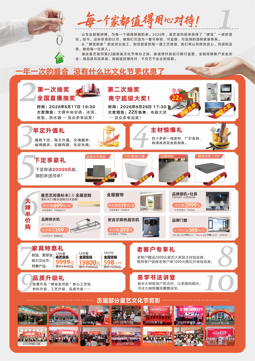 2026年中國(guó)星藝第22屆家裝文化節(jié),全國(guó)400多家直營(yíng)門店聯(lián)動(dòng),年度巔峰讓利,搶2億裝修豪禮,讓幸福啟程。星藝人將以最專業(yè)的團(tuán)隊(duì),最經(jīng)典的設(shè)計(jì),最貼心的服務(wù)、最堅(jiān)實(shí)的品質(zhì)、最期待的鉅惠,將一場(chǎng)裝飾文化盛宴,獻(xiàn)禮綠城,具體優(yōu)惠如下: